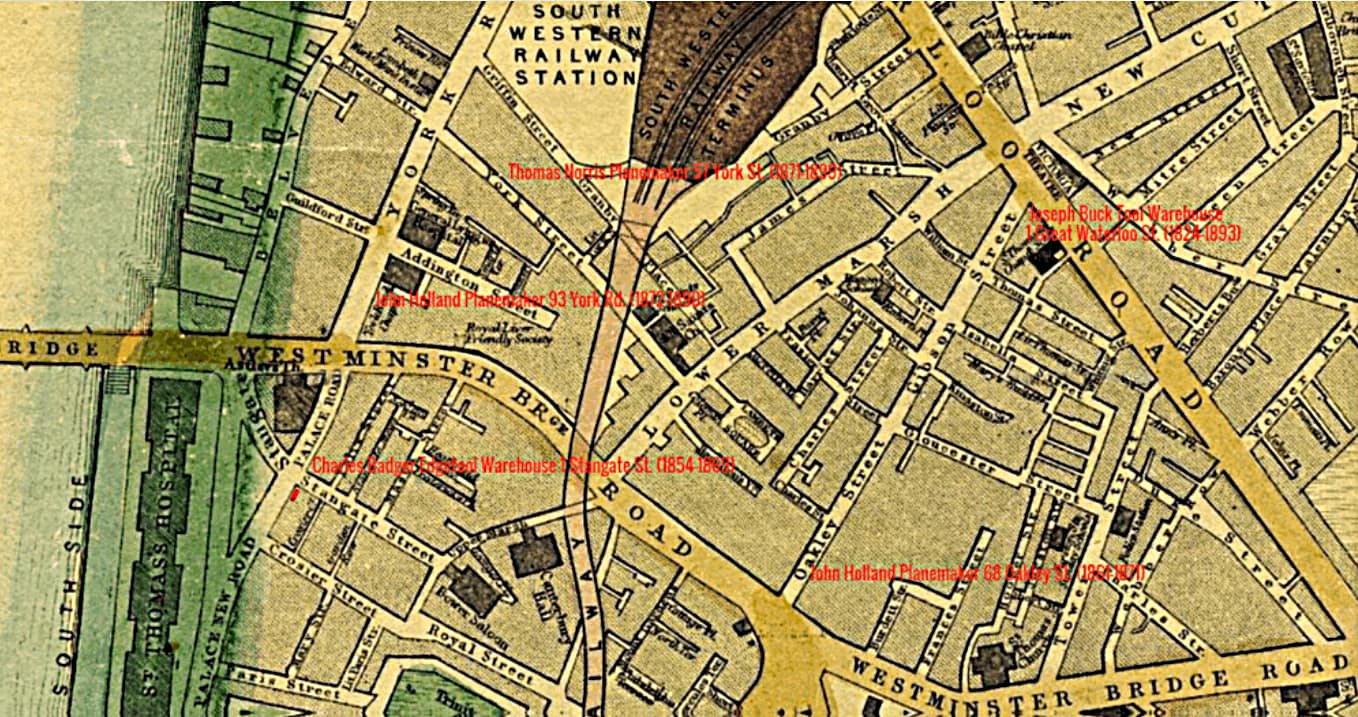 Map section shows the following: Joseph Buck, brother of George Buck, b 1802. planemaker and dealer, 164 Waterloo Rd. (1824-1893); Charles Badger, iron planemaker, 1 Stangate St. (1854-68) 93 York Rd. (1868-1869); John Holland, planemaker, 68 Oakley St. (1861-71), 93 York Rd. 1871-90); Thomas Norris tool and planemaker 57 York St. (<1871-1899).