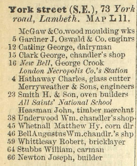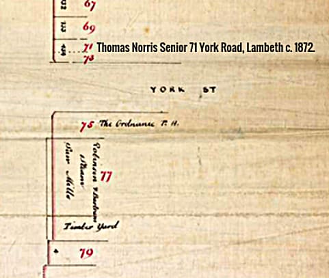 York Road, East side, T. Norris Toolmaker, 71 York Road (1 year only). From London Post Office Dirctory, 1872.