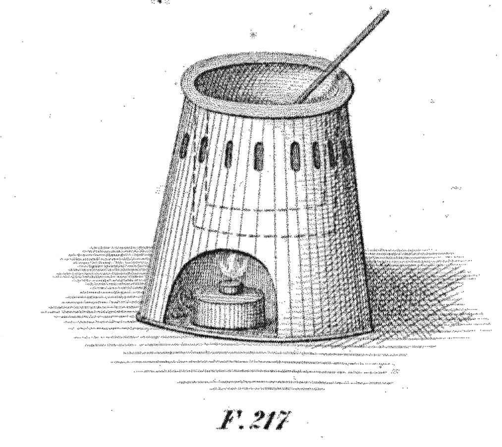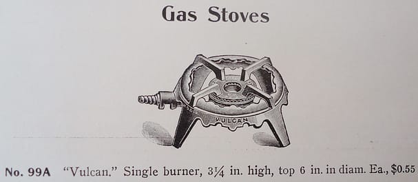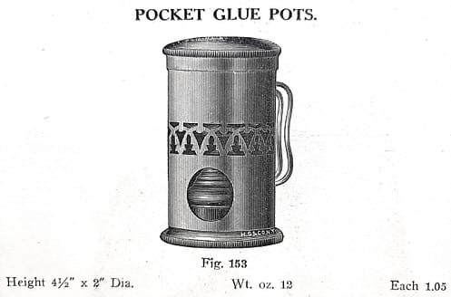 Glue pot with alcohol burner underneath. “Unsettled Market; Prices are subject to change without notice.” (1905) The triangular vents or flues are for use with an alternative kerosene burner which does not burn as cleanly as alcohol fuel.