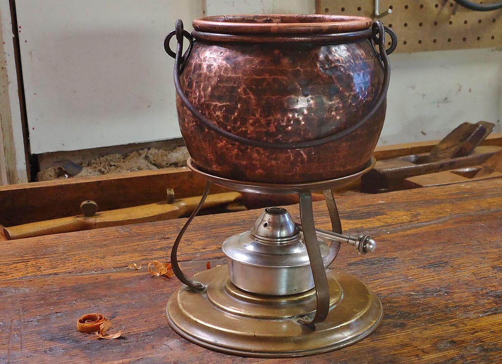 “Glue Pot.– A glue pot recently perfected consists of a circular kerosene lamp, made of tin, resting upon a tin bottom 8 1/2 inches in diameter. The lamp is fitted with a tin chimney in place of glass, and fitted with a small aperture, covered with mica, so as to see how to regulate the flame. The glue pot is made of copper, tinned on the inside and supported upon a rim setting up about six inches from the bottom of the lamp, the rim supported by three legs, soldered and riveted to the rim and bottom of lamp rest. The pot in which the bottom is placed has a portion of the bottom arched, to give more heating surface, and connecting with the chamber under the pot is a flue, passing out and up alongside of the pot, which carries off any smoke from the lamp, and also acts as a draft to the flame. This pot is five inches in diameter, and about six inches high. The pot for the reception of the glue is set in the same as an ordinary glue pot, and will hold about a quart of glue. The whole can be carried to any place where you wish to use it, and still have the heat kept up. The cost of oil is but a few cents a week. Another improvement is in the pot being of copper, tinned. It will not corrode and spoil the glue, as is the case with iron.” From “The Practical Cabinet Maker and Furniture Designer’s Assistant,” written by Frederick Thomas Hodgson in 1910.