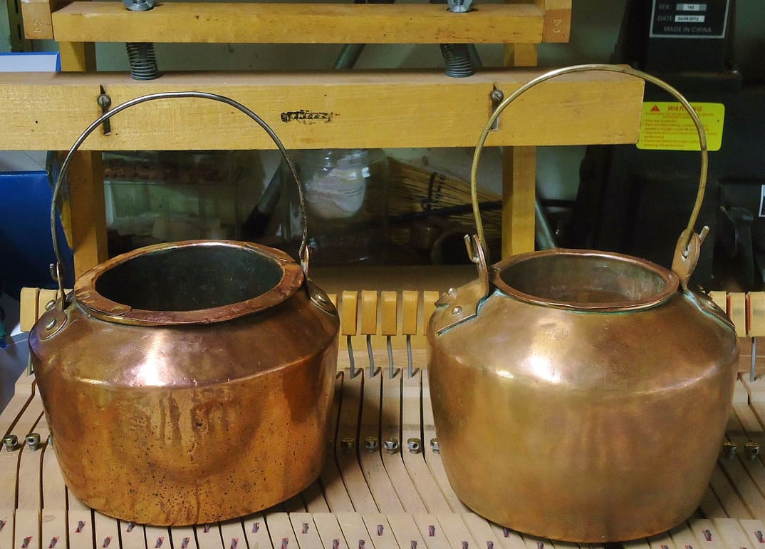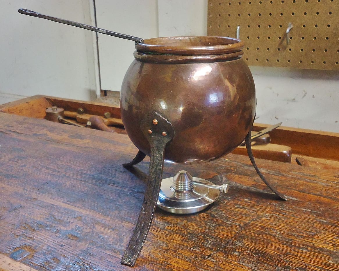 Copper glue pots were prevalent in France starting in the 1700s, and to a lesser extent in England and the United States. Copper was used because of its ability to conduct heat, which means that the metal heats up quickly. Its also true, though, that copper releases heat just as quickly. But this is obviated by the use of an outer pot containing water, which holds the heat much longer. These pots were often made by individual coppersmiths, or in workshops, such as those within the copper making community of Villedieu, France. Many variations of construction can be seen in these pots historically; joining methods employed would include dovetailing, overlap dovetailing, folded joints, riveted joints, and soldering. The coppersmith would start using flat sheets of copper, bending and planishing into shape, using the above methods of joining. Other pots utilized copper sheets compressed into iron or steel forms, then the various components would be brazed together. Some copper pots would be made of ‘bright copper,’ meaning that the level of finish would be as refined as teapots and other copper vessels for the table and in cooking. Others, however, would be completed with less attention to detail, with an eye towards sturdiness. In England and the United States, starting in the mid 18th century and to the late 19th century, a significant number of copper glue pots were made just like teapots, with the exception of a spout and the addition of an inner pot for the glue.