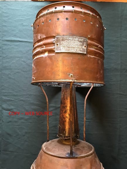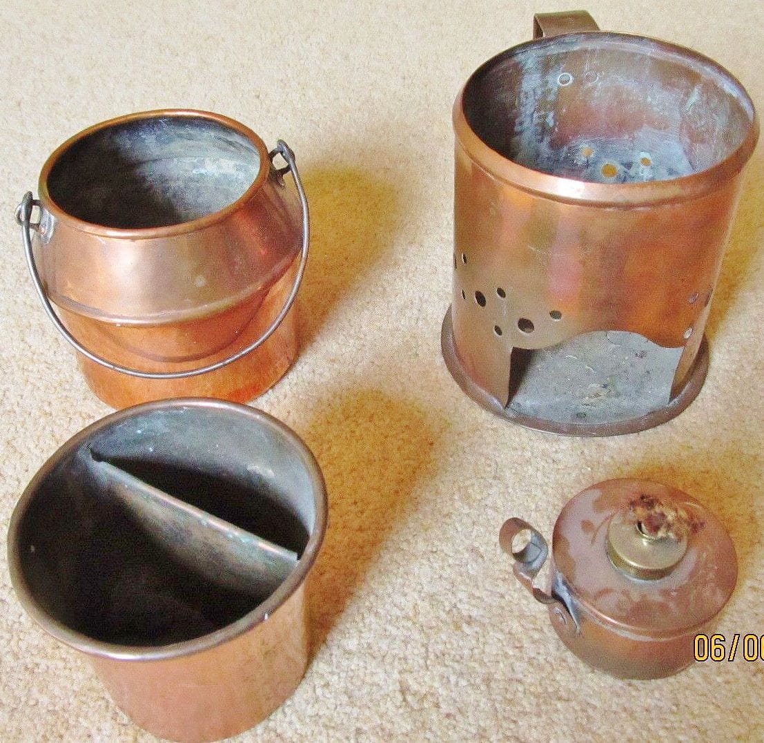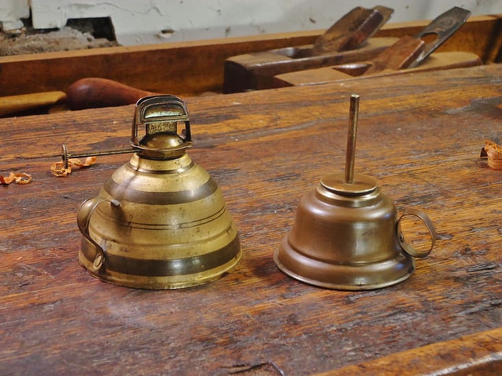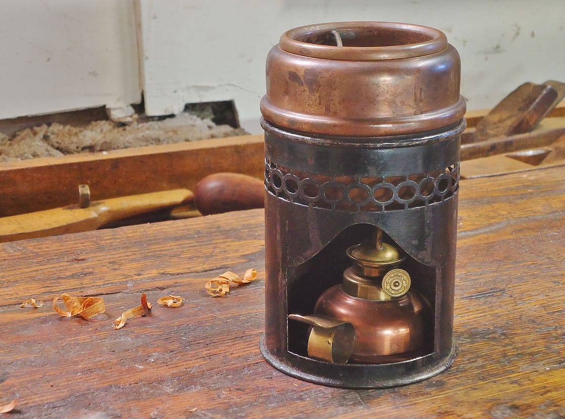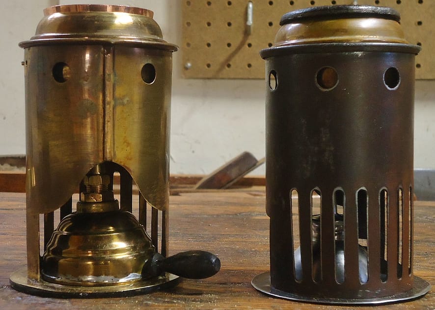 Glue pot with heating shroud, intended for use with an alcohol burner (but could be used with a Kerosene burner), and glue pot originally set up for use with a kerosene burner. Alcohol burns cleaner than kerosene, hence the open arrangement for ventilation.