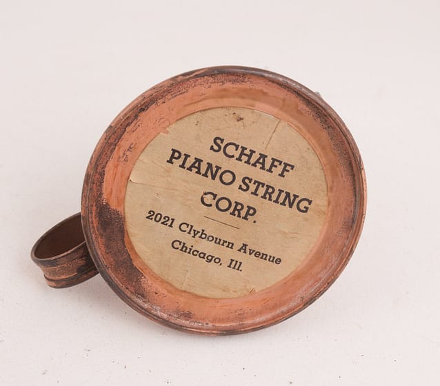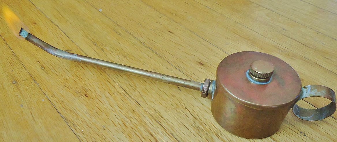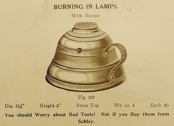 Alcohol lamp, for cabinet finish burn-in repairs as well as bending wooden hammershanks. From Schaff Piano String Co., Chicago, IL, circa 1915.