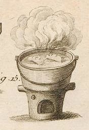 As seen in the cross section, the French glue pot had arrived at its final form, with double boiler and wrought iron legs. Also show are two hide glue applicating brushes, made of hog hair bristles, and attached to handle with wrapped cord instead of a metal ferrule, in order to avoid staining the glue. Roubo c. 1773.
