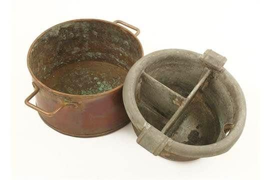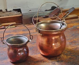 Two smaller globular shaped French glue pots with legs. The legs serve as an extra buffer between the heat source besides the water-filled outer pot and the hide glue.