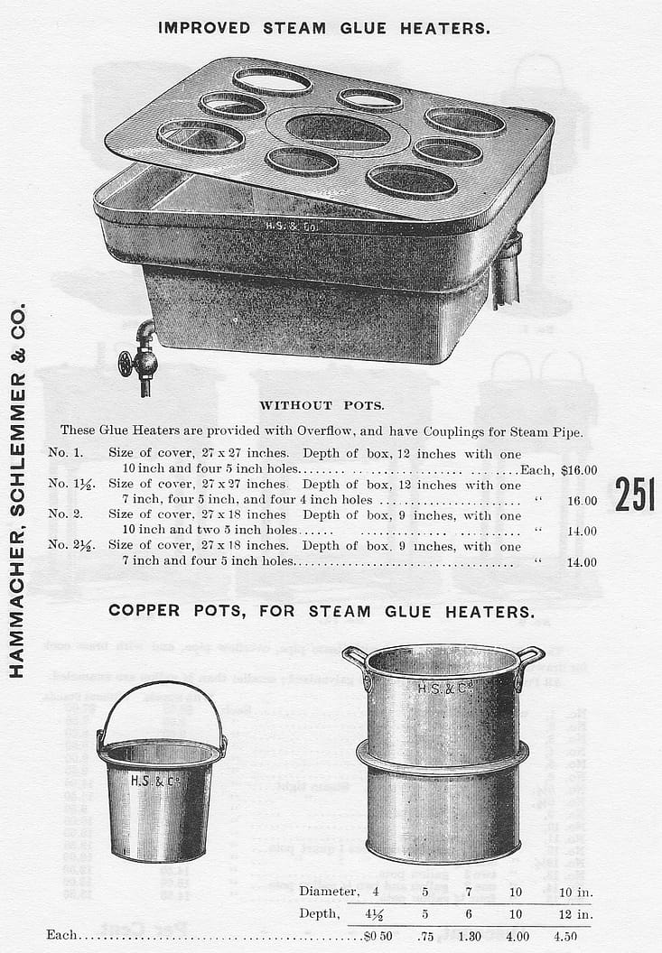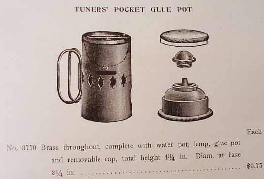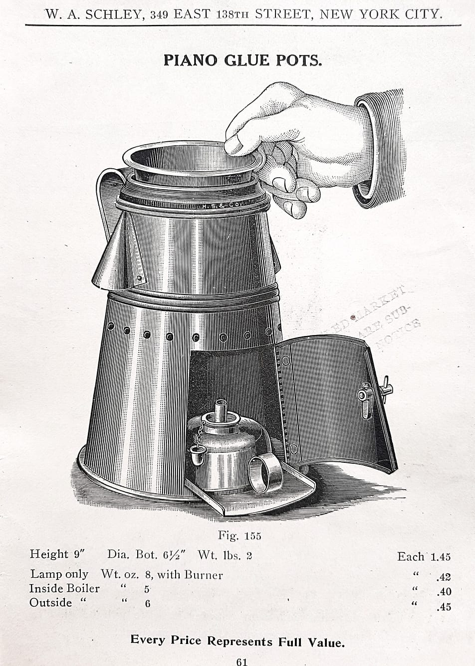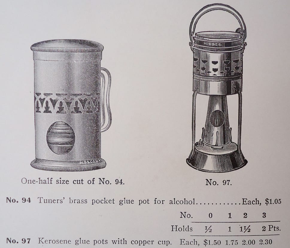H.S. & Co., N.Y., 1885 catalogue. Small hide glue pot setup, for the traveling tuner. And medium sized glue pot combination.