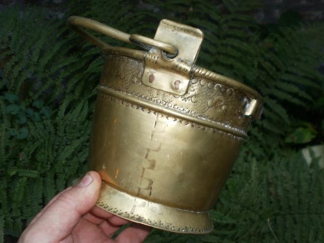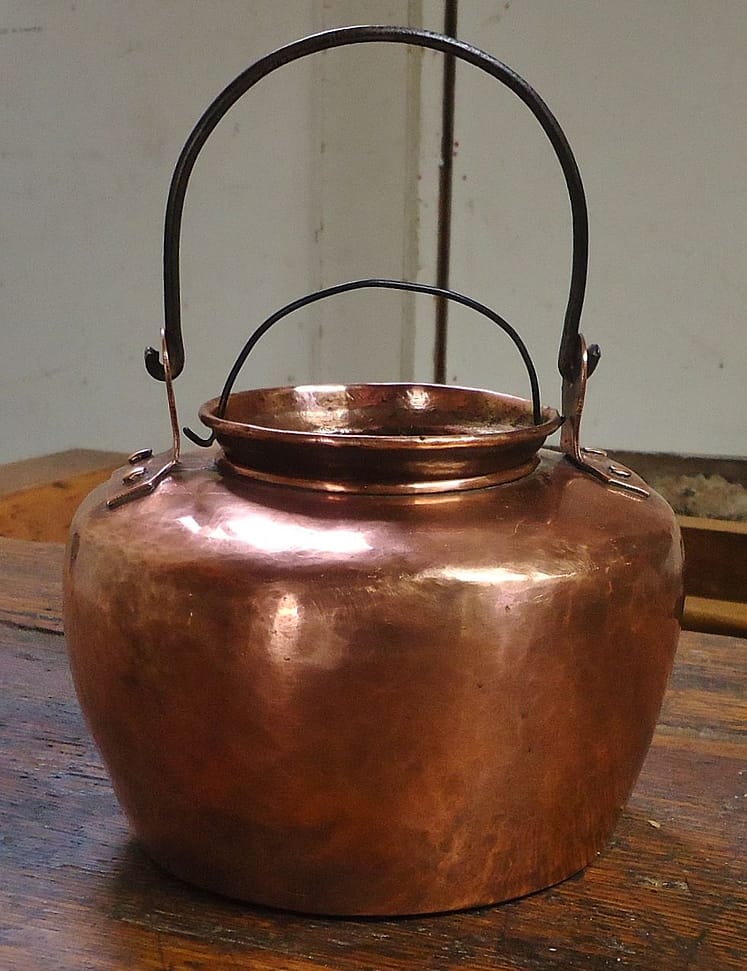 Rustic and small copper glue pot, probably English. Copper conducts heat very efficiently, and also inhibits glue spoilage and mold, functioning as a biocide. Rust from the iron glue pots can really stain the glue; with copper glue pots, this is not a problem.