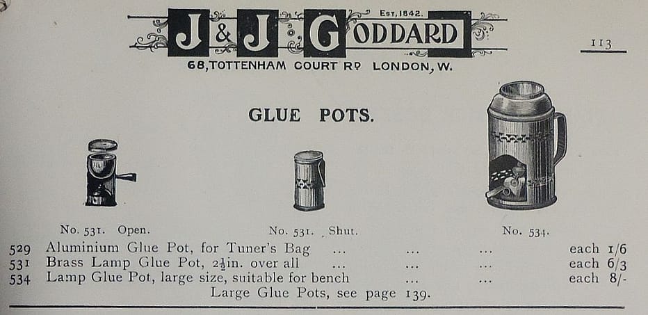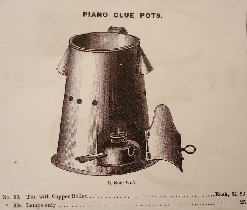 Use of hide glues in piano construction and restoration have essentially been the universal adhesive right up to the advent of World War II. Postwar, PVA or yellow wood glue, epoxies, contact cements, and CA glues were adopted for various specialized uses. But modern piano technicians, restorers and repairers, keep returning to hide glues because of its reversibility and lack of creep, or movement under stress. While one can make a glue pot with a modern adjustable hot pot for cooking purposes very cheaply, it is instructive to look at the ways that hide glue was kept in its fluid state historically. After all, some of the best pianos and musical instruments ever made were produced without an electrical dial to achieve a 140 degree F optimal temperature.
