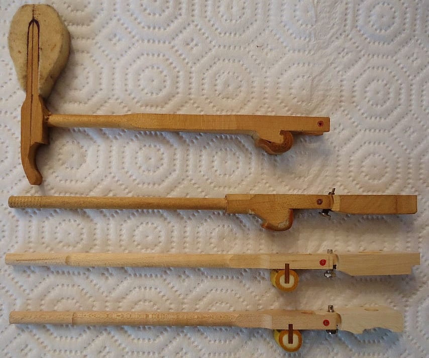 Top to bottom: Thayer shank with hammer; thayer shank & flange; Knabe type shank & flange, with conventional knuckle; Steinway type shank & flange, also with conventional knuckle.