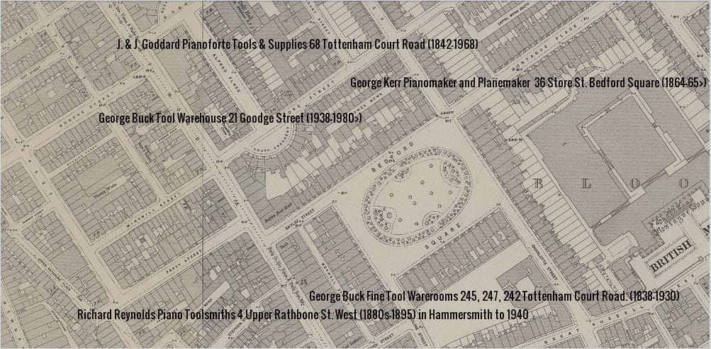 J. & J. Goddard’s piano tools and supplies warerooms at 68 Tottenham Court Road, and his neighbors in allied trades during the 1860s: George Buck tool seller, 245 Tottenham Court Road; Richard Reynolds, piano ironmonger/toolsmith, 4 Upper Rathbone Place; George Kerr, planemaker, 36 Store St. Bedford Square.