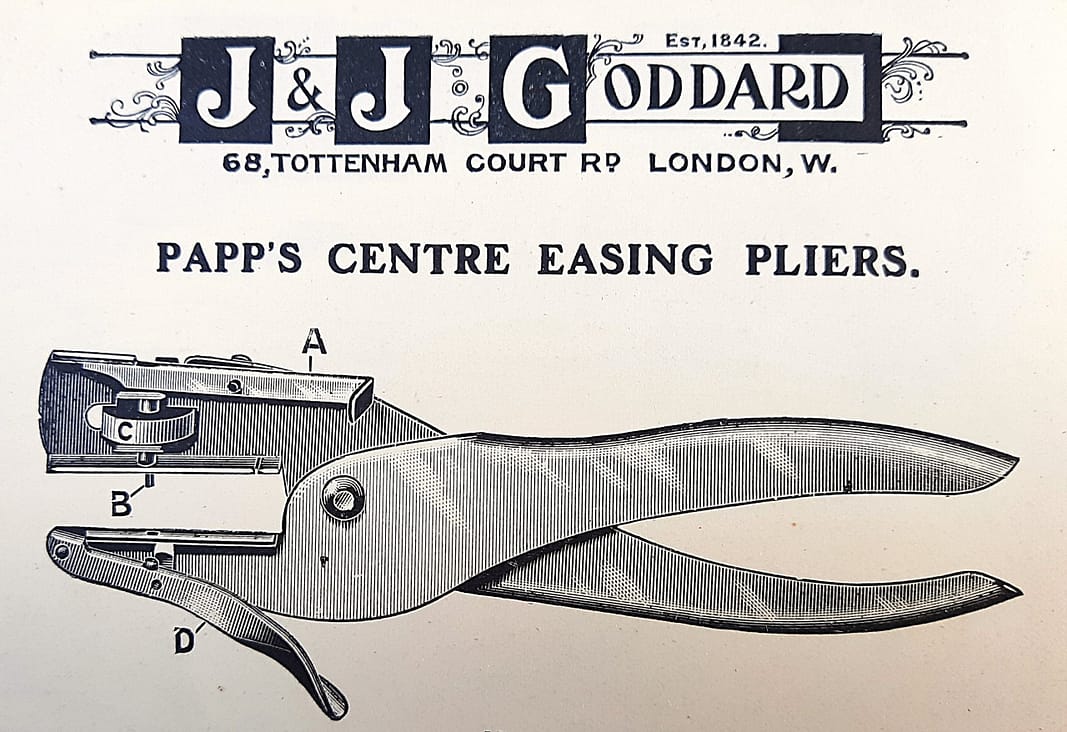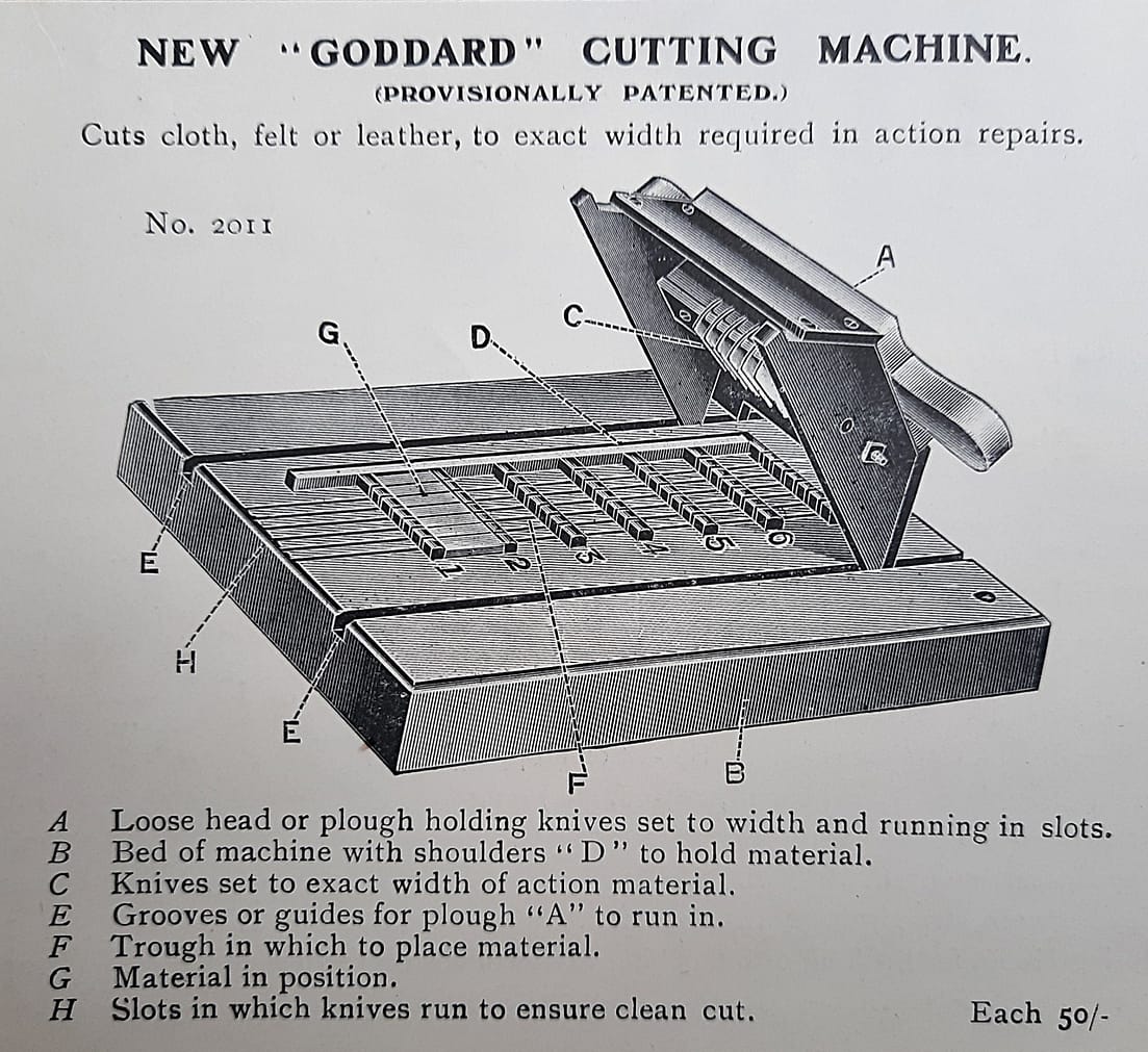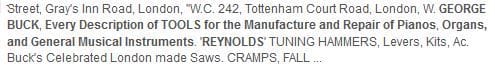 In contrast to George Buck, a competing business at 245 Tottenham Court Road, J. & J. Goddard prominently advertised Richard Reynold’s piano tools. George Buck & Co. had a policy of selling their better tools stamped as their own; if a tool was bought in with an R. REYNOLDS stamp, Buck would either overstamp it with the BUCK stamp or file off the Reynolds stamp first.