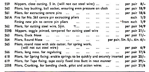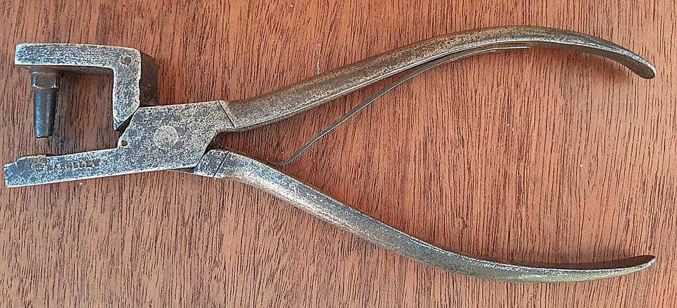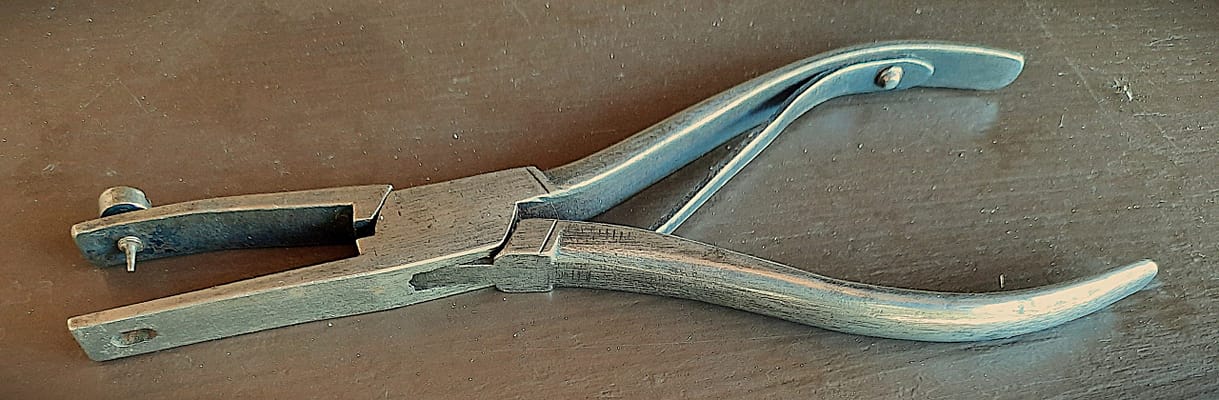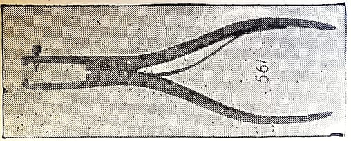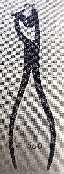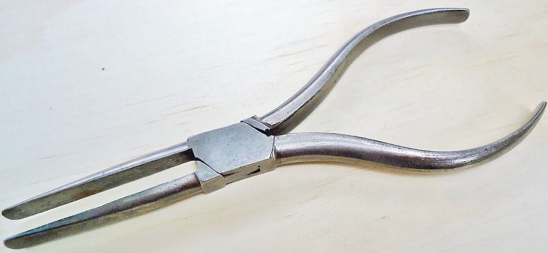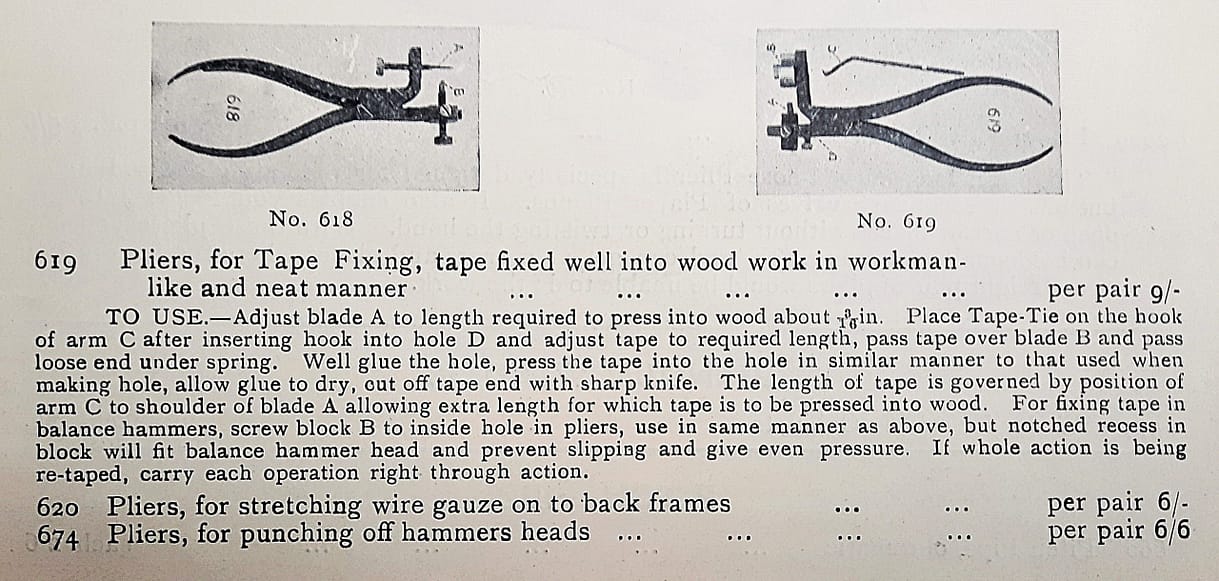 Parallel piano pliers–meaning that the jaws are parallel at the width of an average piano action part. Sold by George Buck. Similar to #566 in the Goddard catalogue.