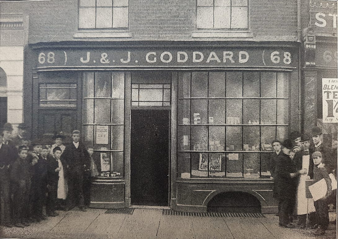 J. & J. Goddard was at 68 Tottenham Court Road until 1968. The last address I could find for them was at 37 Union Street SE1, London, in 1970. Visible from the Goodge Street Station, the “J.& J. Goddard” sign continues to look good, because it was set in tile, not just painted.