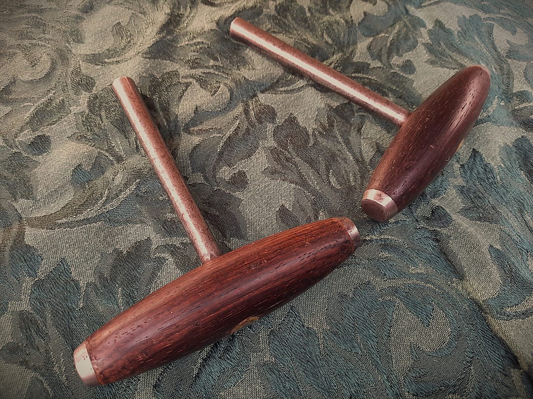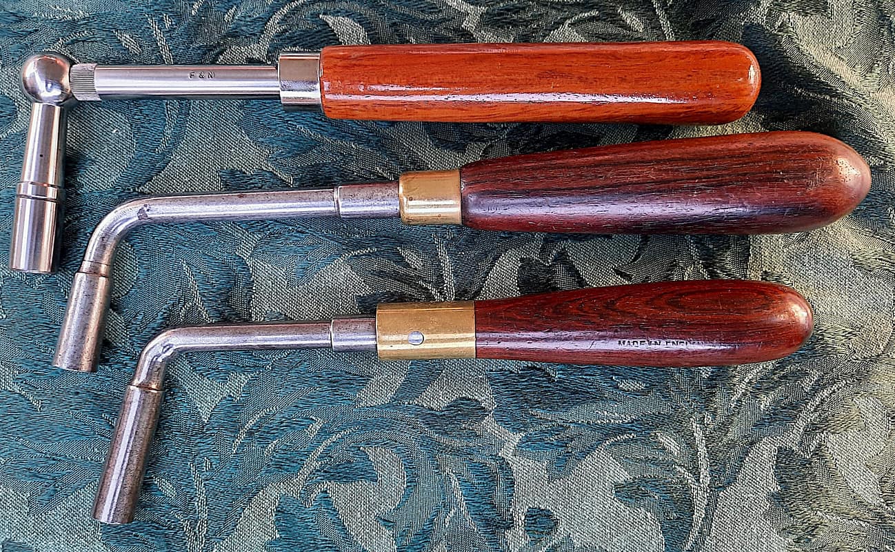 J.& J. Goddard tuning lever with walnut handle, made by Reynolds, bottom; R. Reynolds heavy duty lever with Cuban mahogany handle, top.
