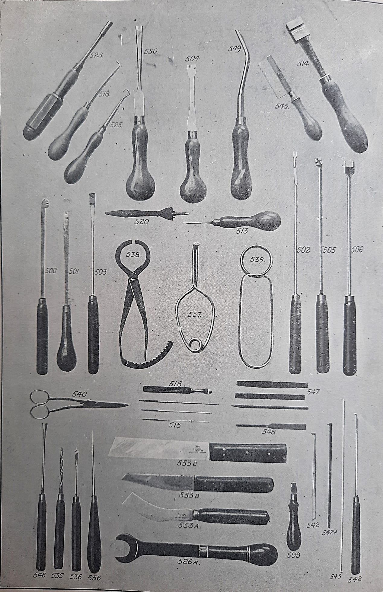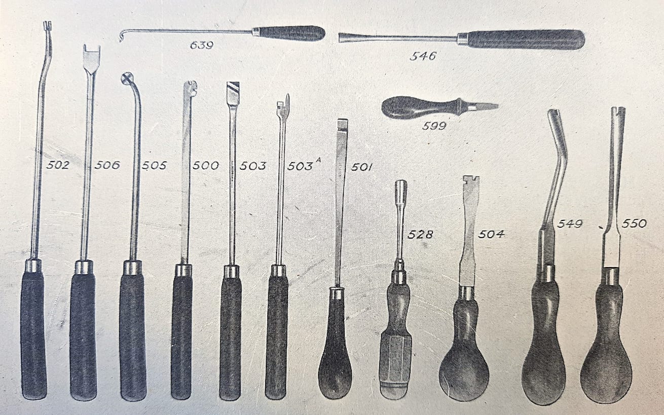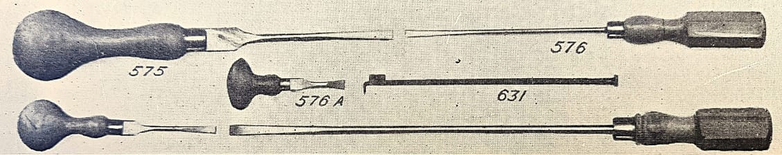 J.&J.Goddard Toning Needles in the 1920 catalogue. No. 584A was the imported Hale adjustable voicing tool, which was shown in the no. 70 catalogue, circa 1935. A British copy of the Hale adjustable voicing tool was shown in the 1950 G. F. Baker catalogue, and the same tool was shown in the 1976 Fletcher & Newman catalogue—Baker was bought out by them. I have not seen a patent for this type.