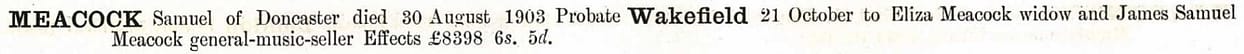 Samuel Meacock died well off. Adjusted for inflation, would be £840,181. If anyone knows what a Meacock pattern tuning hammer is, please enlighten me. I did find a Samuel Meacock (1826-1903), who was an organ builder and piano dealer in Doncaster, Yorkshire.