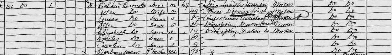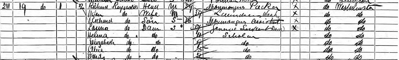 At the time of the 1901 census, five children were living at home with Richard Reynolds and his wife, Ellen, and he stated his profession as “ironmongers and stockkeeper. Worker.” Utterly without pretense.