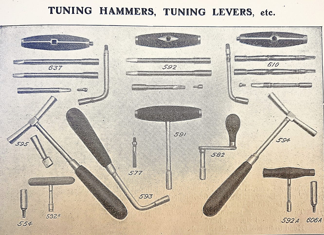 These Reynolds “T” Hammers are still commonly found in the U.K., in quality piano tuners’ toolkits from the late 19th century. Combined with the fact that “T” Hammers were offered in British Piano Supply Catalogues in many shapes and sizes into the 1930s, suggests that the “T” Hammer was used for tuning well into the 20th century, but diminishing with the passage of time.