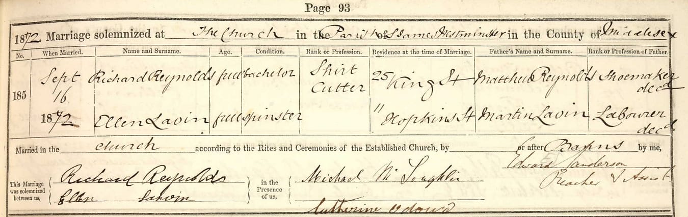 Ellen Lavin married Richard Reynolds at the parish of Saint James in Piccadilly Square, on 16 September, 1871.