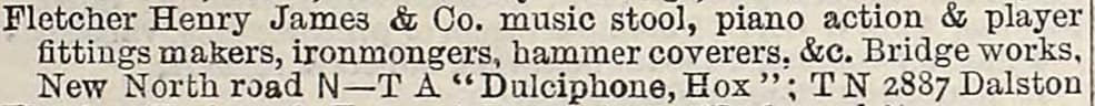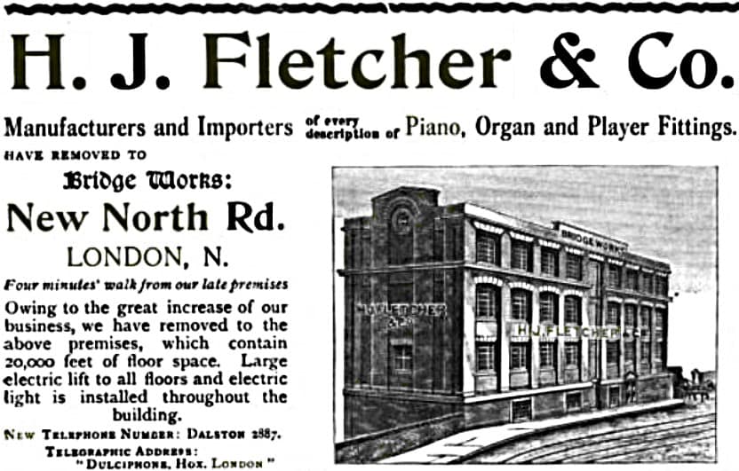 New Bridgeworks address for H.J. Fletcher as advertised in “Musical Opinion and Music Trade Review,” June, 1912, p. 704. Although there is no street number for this large building, it must have been close to the New North St. bridge that crosses the Regent’s Canal.