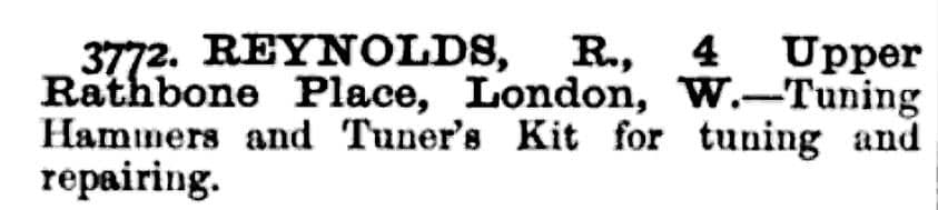 Reynolds was described in British trade publications as “music smiths; [with] Tuning hammers and Tuner’s kits for tuning and repairing.” Richard and his son operated from 4 Upper Rathbone Place, London, circa 1885, and into the 1890s.