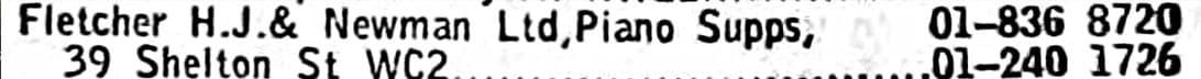 H.J. Fletcher & Newman Piano Supplies, 39 Shelton St., Covent Garden, London, as shown in the London Phone Directory for 1968.