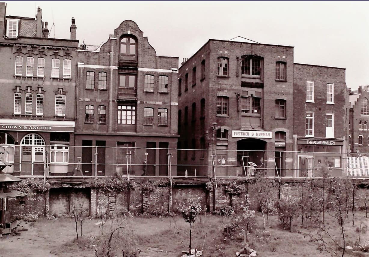 b/w photo of Fletcher & Newman at 39 Shelton St., Covent Garden, in the late 1970s. The Crown and Anchor was a pub that was established on Shelton St. since 1904; the Acme Gallery was a a progressive art gallery that is still active in supporting local London artists by providing housing. Photo from fletcher-newman.co.uk