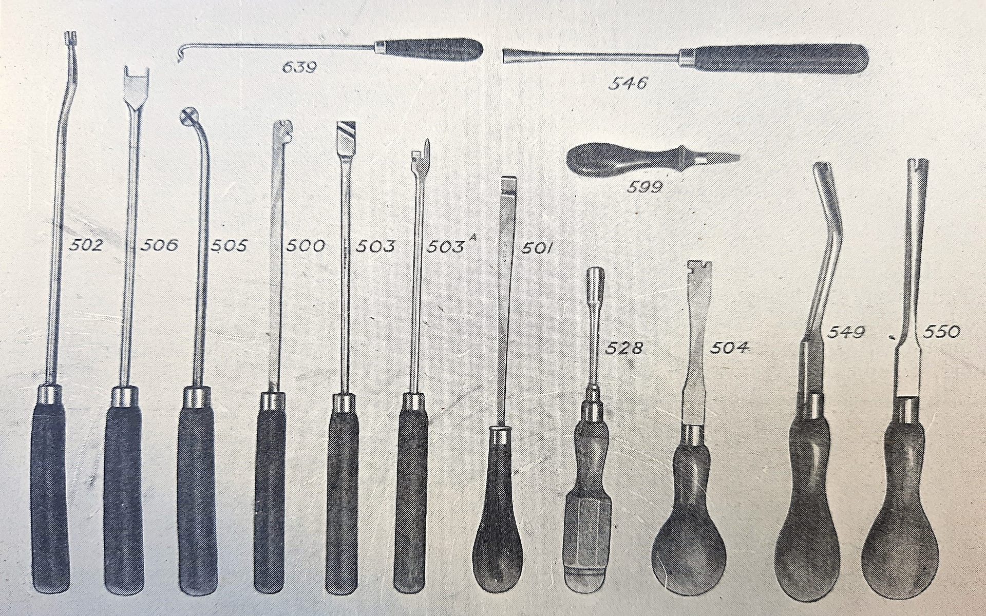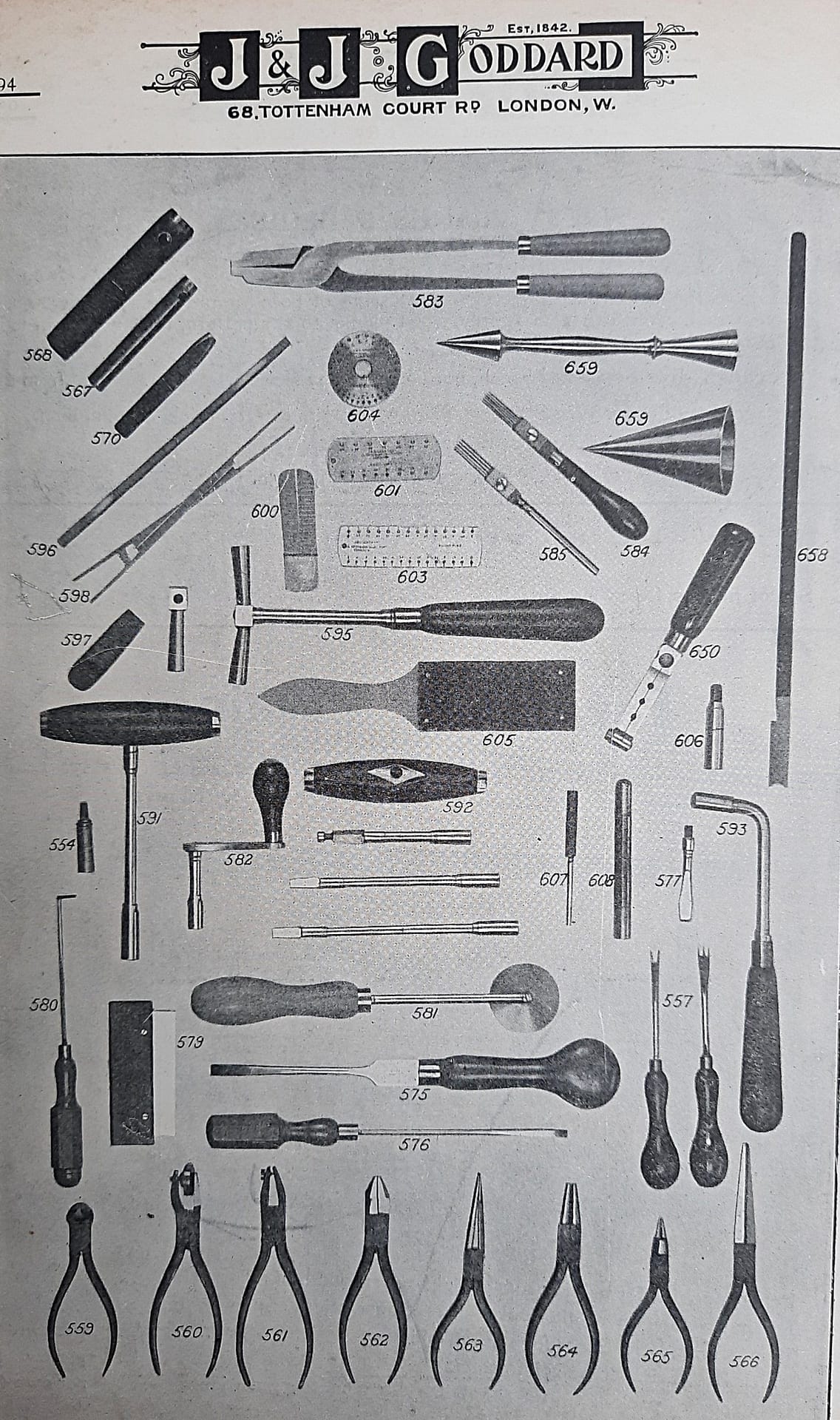 J.&J.Goddard Toning Needles in the 1920 catalogue. No. 584A was the imported Hale adjustable voicing tool, which was shown in the no. 70 catalogue, circa 1935. A British copy of the Hale adjustable voicing tool was shown in the 1950 G. F. Baker catalogue, and the same tool was shown in the 1976 Fletcher & Newman catalogue—Baker was bought out by them. I have not seen a patent for this type.