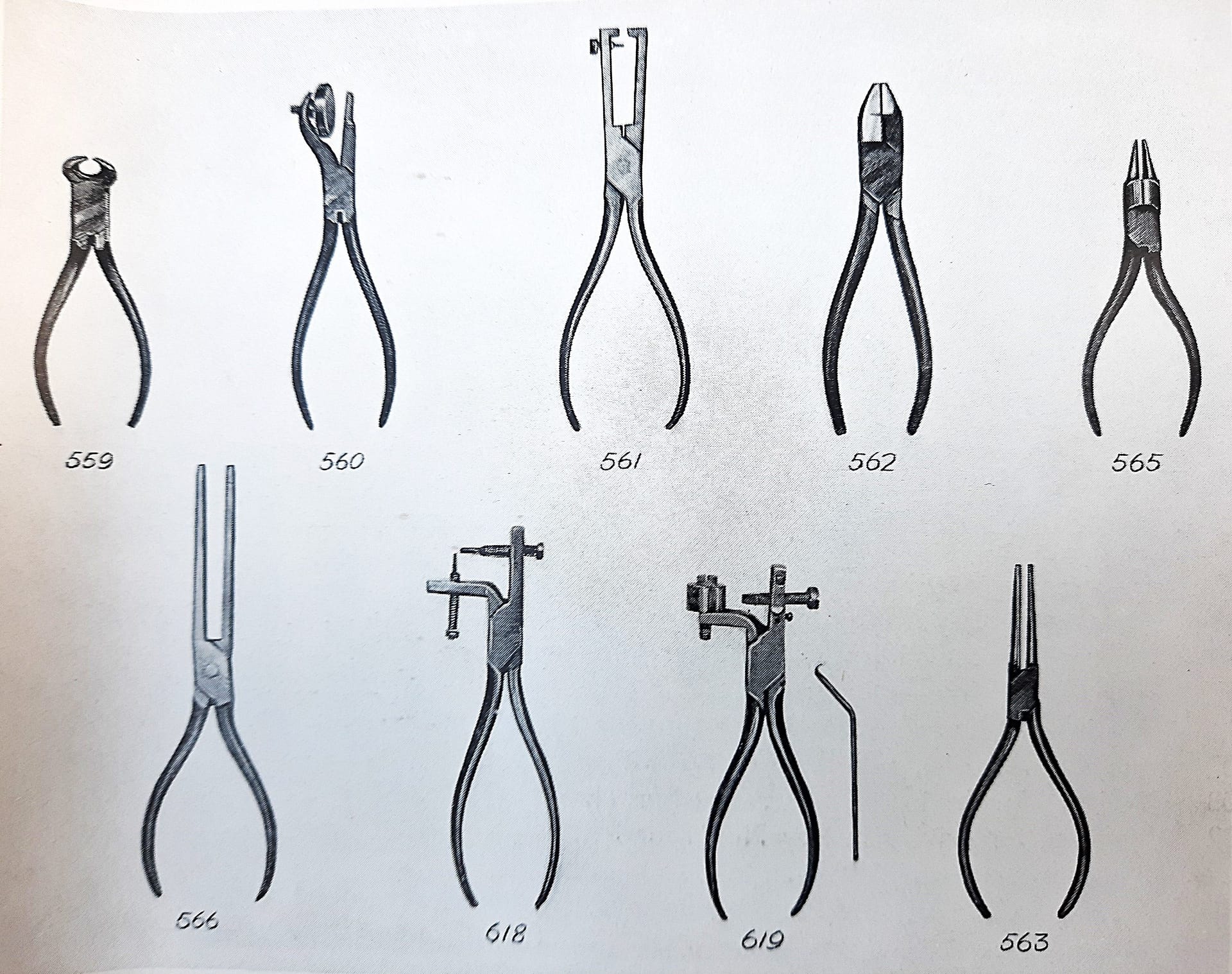 Parallel piano pliers–meaning that the jaws are parallel at the width of an average piano action part. Sold by George Buck. Similar to #566 in the Goddard catalogue.