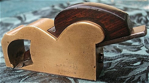 Goddard carried a large selection of planes, including a comprehensive range of wooden bench planes and Stanley iron planes. Goddard wrote, “any pattern plane supplied” in their 1920 catalogue. This steel-soled gunmetal bullnose plane has “Goddard London” inscribed on its side, which is partially visible in this photo. Goddard wrote, “any pattern plane supplied” in their 1920 catalogue. This steel-soled gunmetal bullnose plane has “Goddard London” inscribed on its side, which is partially visible in this photo.
