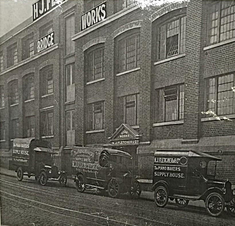 Henry James Fletcher & Company, “Bridge Works,” at New North Road, London, circa 1916. At that time, H.J.Fletcher was a large operation, serving the immense London pianomaking trade.photo from fletcher-newman.co.uk