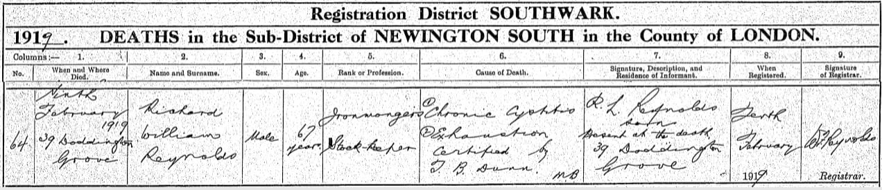 Richard Reynolds, Jr and Sr., in the 1919 Electoral Register in Southwark, Richard William Reynolds Sr., 68, and his son and successor in business, Richard Louis Reynolds Jr., 44, in the Electoral Register for Doddington Grove, New Street, Southwark, Surrey, in 1919.
