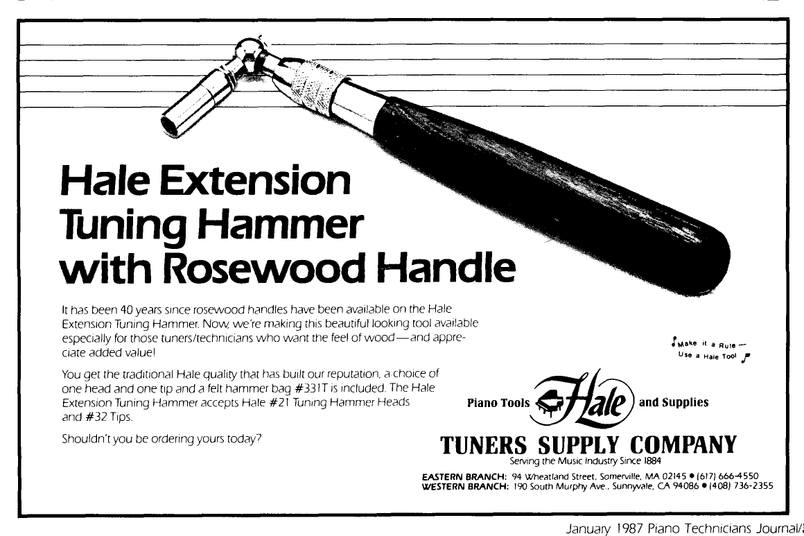 “In 1992 American Piano Supply Co. purchased the assets of Tuner’s Supply Co. of Somerville, Massachusetts. Included in the acquisition were the production equipment and the rights to use the well-known “Hale” name. APSCO stocks a large selection of tuning hammers (including the