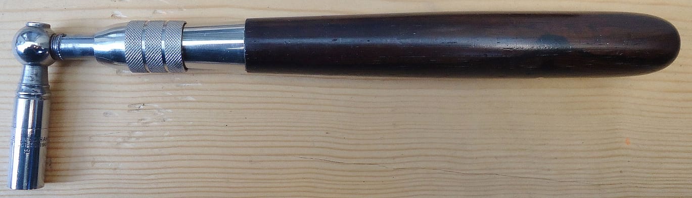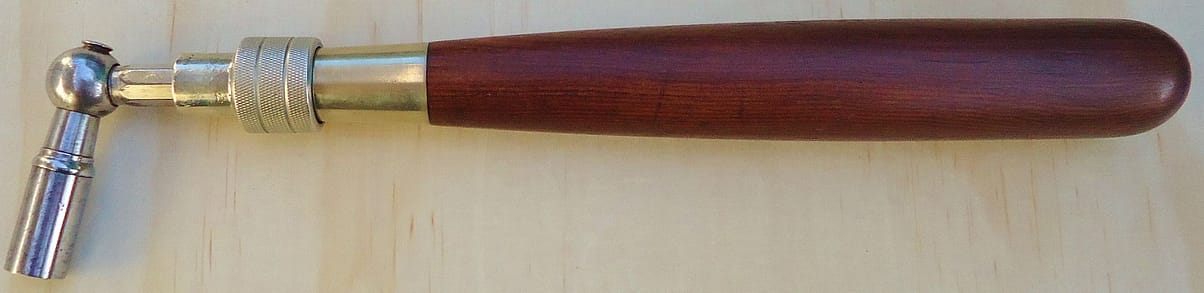 Unthreaded, friction-fit “Heavy Duty” Hale model, c. 1920-1940. Hale’s “Heavy Duty” extension tuning hammer was intended for stringing, chipping, and rough tuning in factories. It was a user tool for me, and I worked with it every day, but not for all of my tuning work. The fact that the shaft goes all the way through the head and past the fulcrum of rotation, makes this arrangement as close as one can get to tuning with a “T” hammer, but still having the leverage advantage.
