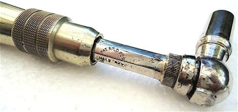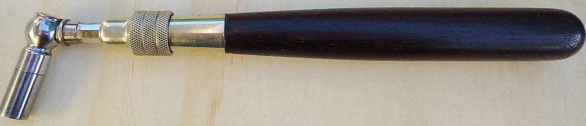 Pre-patent Hale Extension Tuning Hammer. “Pat. Apl. For.” Close up of hardware with single set screw, rather than collet.