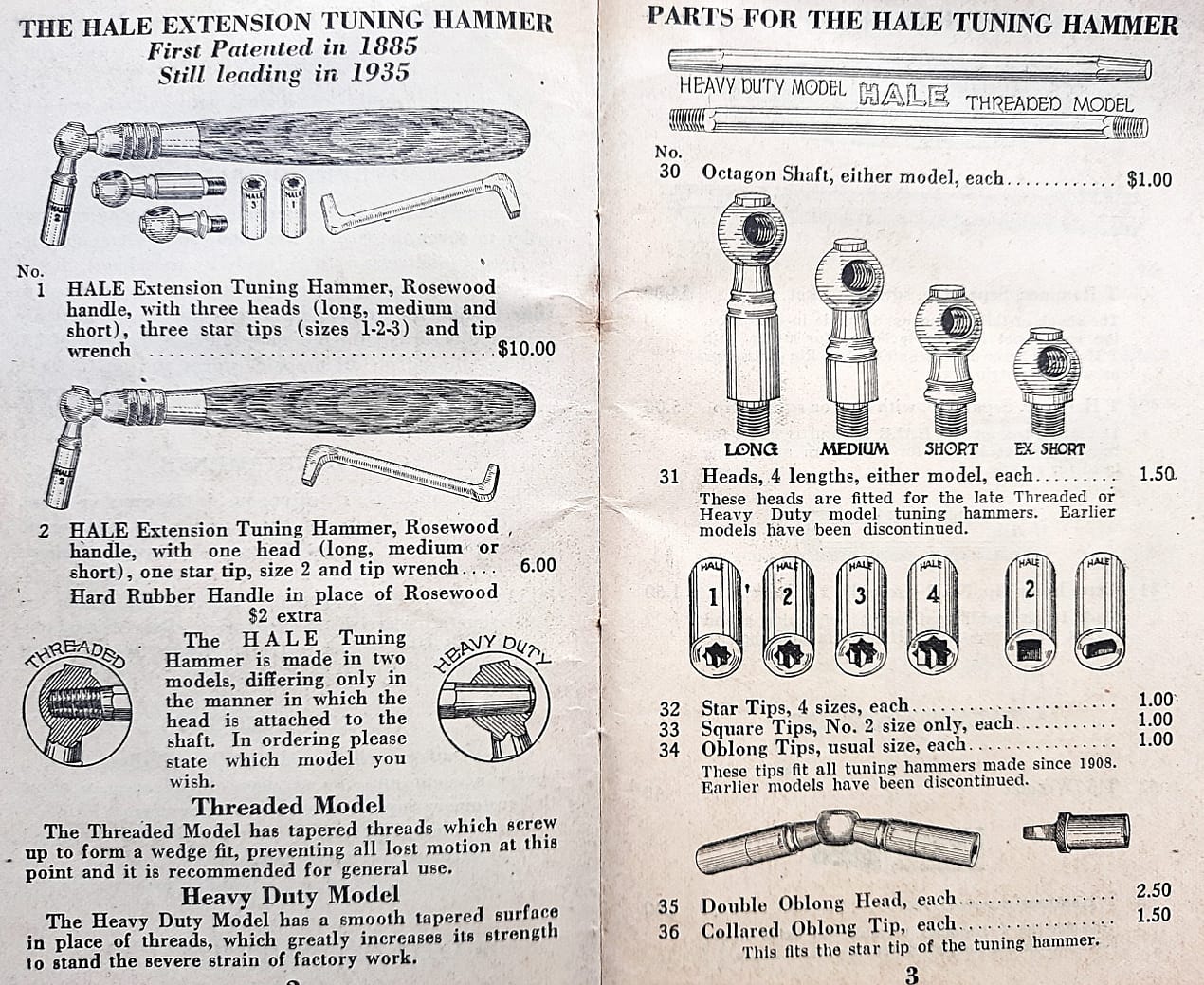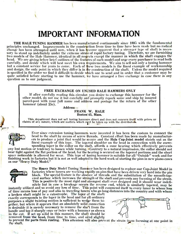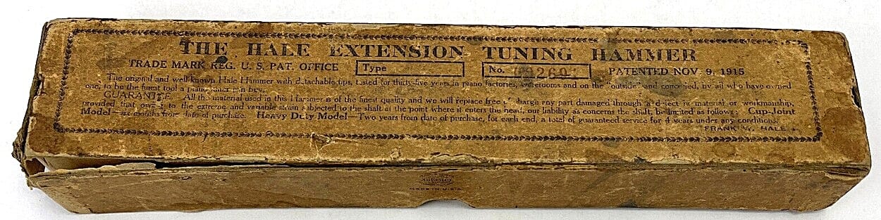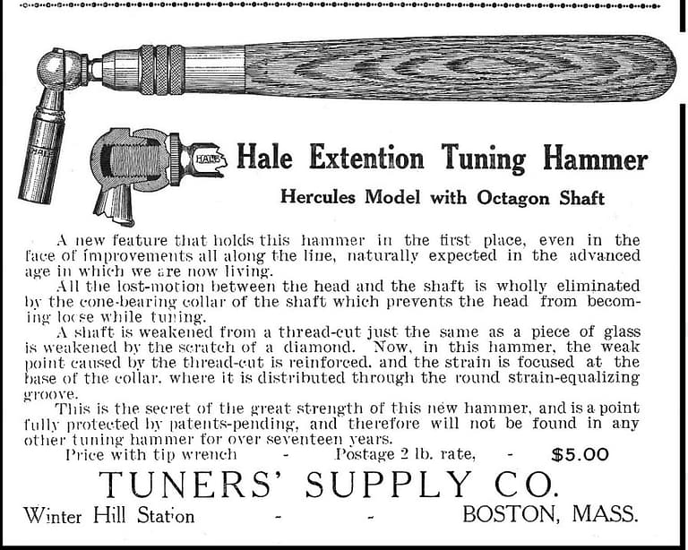 “In 1885, Frank W. Hale, then a teacher of Piano Tuning in the New England Conservatory of Music, was granted the first patent on an extension hammer with detachable tips. Since that time improvements have been made to keep this tool the leader and today is is known throughout the world as the most practical tuning hammer a tuner can own.”