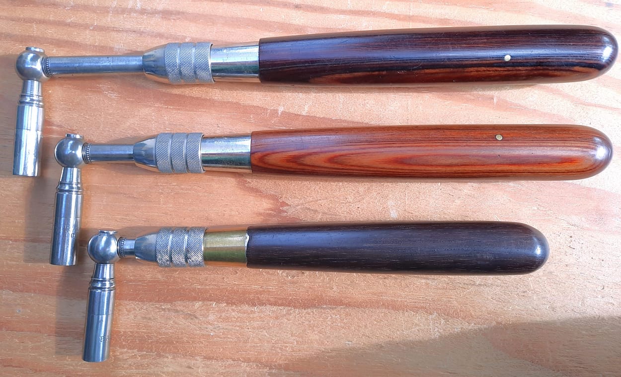 Two early “Artwood” Tuning Hammers, c. 1946-1953, and solid rosewood Tuning Hammer, c. 1941-1945, shortened by Peter Wolford.