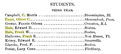 Boston University Yearbook for 1884. This was the entire third-year class in the College of Music, which was established in 1872. The Bachelor of Music was a three-year program at the time; the Bachelor of Arts required the traditional four-year