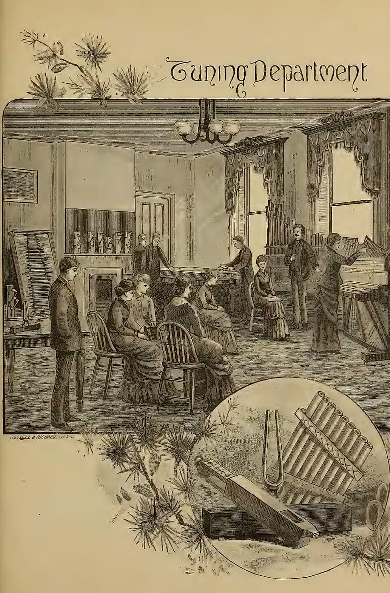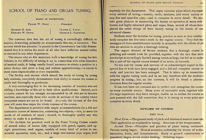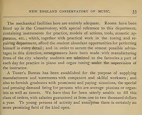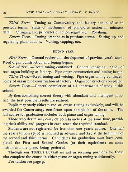 Another advantage of the NEC Tuning program, was the collaboration with various piano factories, permitting students to gain experience tuning pianos in a realistic setting, unlike that of a practice room (1896 NEC Catalogue): “We also take great pleasure in announcing the hearty co-operation of many well known and highly esteemed piano and organ firms, several of whom have placed the entire charge of their factory tuning in the hands of their advanced classes.” I must admit, this sounds a bit overly optimistic to me.