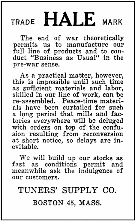 Post-War Business Conditions according to Hale Tuners’ Supply. From “The Tuners’ Journal,” December, 1946.