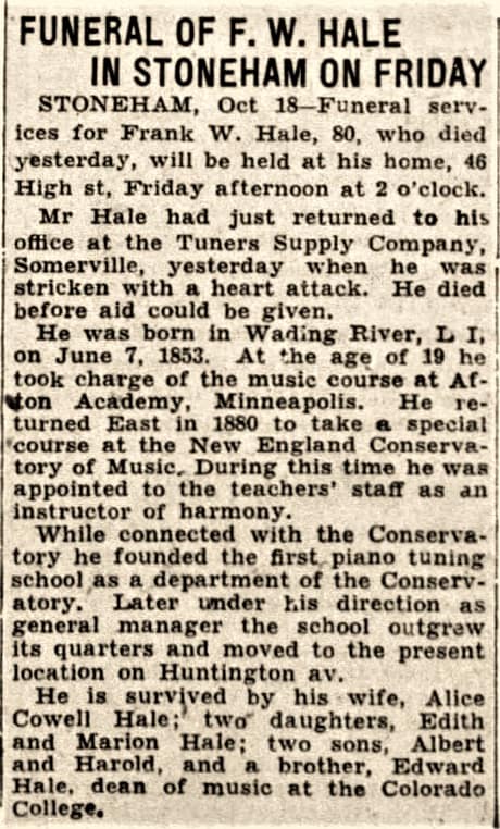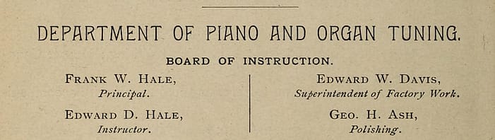Oliver Cromwell Faust (1859–1947), witness to Hale’s 1885 patent, and author of Piano Tuner’s Pocket Companion (1902) and The Pipe Organ and Player Piano–Construction, Repair, and Tuning (1900), was also a music student at Boston University at the same time as Frank W. Hale. Edward Danforth Hale (1859-1945) was a younger brother of Frank Hale, who became a tuning instructor along with Faust for some years of the NEC Tuning Program.