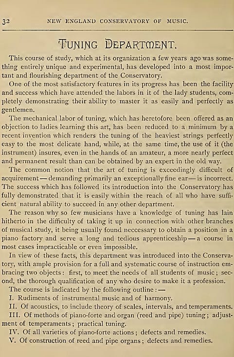 New England Conservatory’s Tuning Department was pioneering for its time; NEC and Hale established the first residential piano tuning school in the United States in 1880. Remarkably, the NEC Tuning Program promoted the enrollment of women into the piano servicing field: “The facility and success which attend the study of tuning by young lady students, completely demonstrates their ability to master the course as easily and thoroughly as gentlemen.” In the 1880s, there was a significant percentage of women enrolled in both the Boston University Music Department as well as NEC. This high percentage of women enrolled in professional music programs was a direct outgrowth of the Victorian ethos around women of a certain class and ‘refinement’ learning about music and the arts.