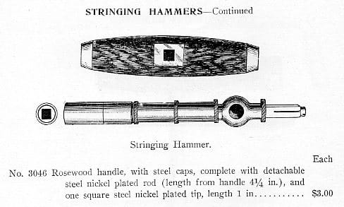 Hale tuning hammer set, c. 1905. Hale’s “T”, or stringing, hammer also featured a socket for the lever, which provided another lever head which was much taller and permitted more clearance over obstructions, such as plate struts and protruding screws, found on many pianos. This was a variation on the patented idea of a single head with multiple sockets.