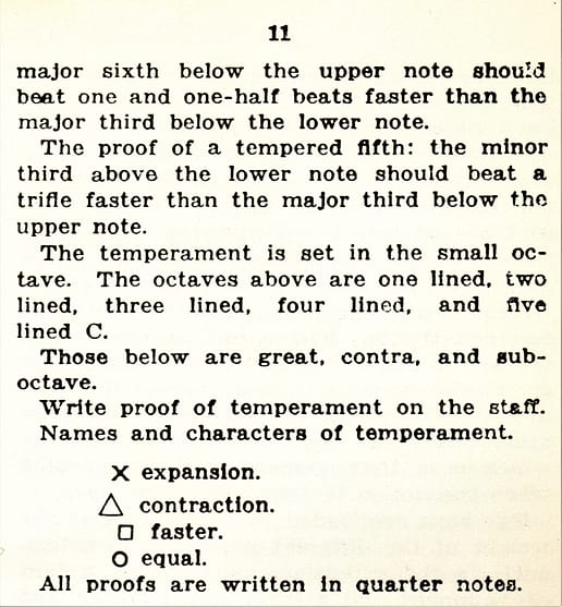 While Frank W. Hale introduced the Tenor C Temperament to his Tuning students in the late 1880s, this pattern did not originate with him, or with Faust, who taught later. The Tenor C Temperament had been circulating amongst tuners in the New England area since the 1850s, and possibly earlier. In The Tuner’s Manual, by Sumner Hill and O.B. Brown, published by Russell & Tolman, 291 Washington St., Boston, in 1859, the Tenor C Temperament was published: