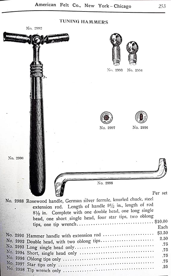Erlandsen’s hammers and tools, dominant from the Civil War to about 1920, had superior build quality and materials on average, but Erlandsen lacked direct experience working on pianos, and the last level of insight into specific tuning and allied skills which would accompany that. Erlandsen’s focus, however, was on providing a wider range of tools and machinery for workers constructing pianos in factories, while Hale was interested primarily with the piano tuner in the field.