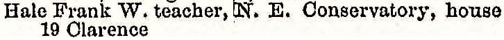Hale listed himself as a teacher at NEC from 1882 to 1890 in the Boston City Directories. From 1892 until at least 1903, Hale was listed as the “General Manager of NEC. ” NEC moved from Franklin Square to Huntington Ave in 1902-1903