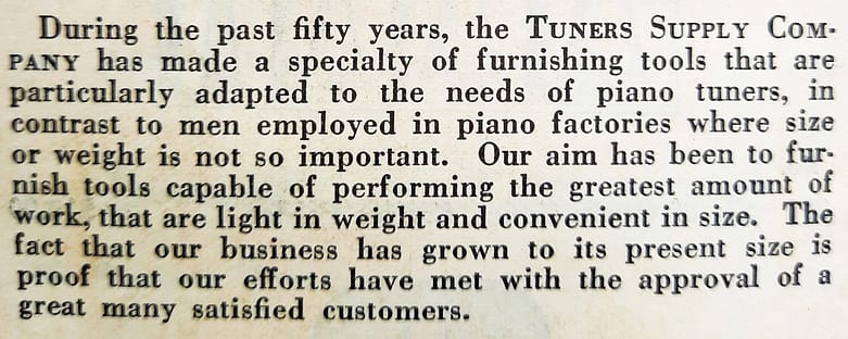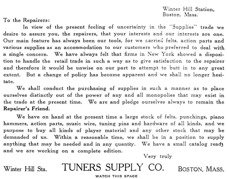 A wartime message (by Frank Hale’s sons) from Tuners’ Supply to their piano service customers. From “Tuners Magazine,” August, 1914.