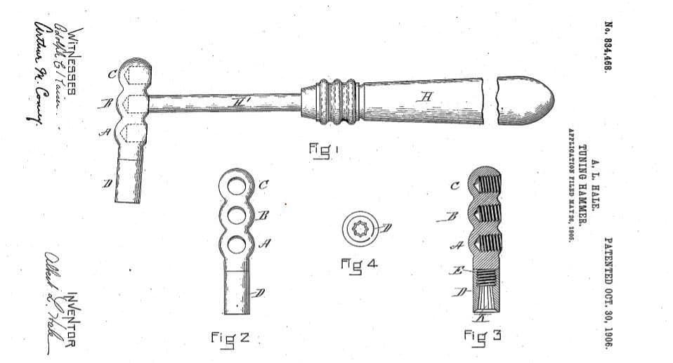 Albert L. Hale’s 1906 tuning hammer patent. “In the style now in common use the breaking of this detachable portion is frequently the source of much trouble and expense, as the intersecting section must be milled or chipped out. This often results in ruining the threads of the head, causing the loss of the entire tool. In my invention, this is impossible.” This is the familiar patent that is marked on the tuning pin tips from the mid teens to the early 1950s. From 1906 to to the mid teens, the tips were marked in various other ways, some with the month and year, and some of the others with (Hale) Tuners Supply, Boston.