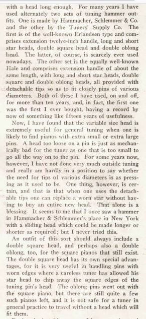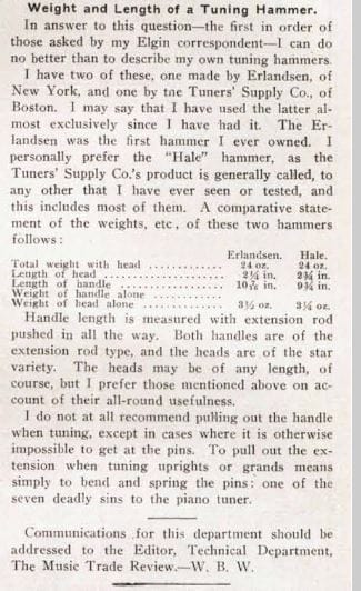 Any discussion of the Hale hammer in the early 20th century invited comparison with the long-established Erlandsen hammer, introduced in 1863. William Braid White (1878-1959), author of Piano Tuning and Allied Arts, 1917, Theory and Practice if Piano Construction, 1906, and A Technical Treatise on the Player Piano Mechanism, 1908, wrote the following comparisons of Hale and Erlandsen tuning hammers as a technical editor in the Music Trade Review: