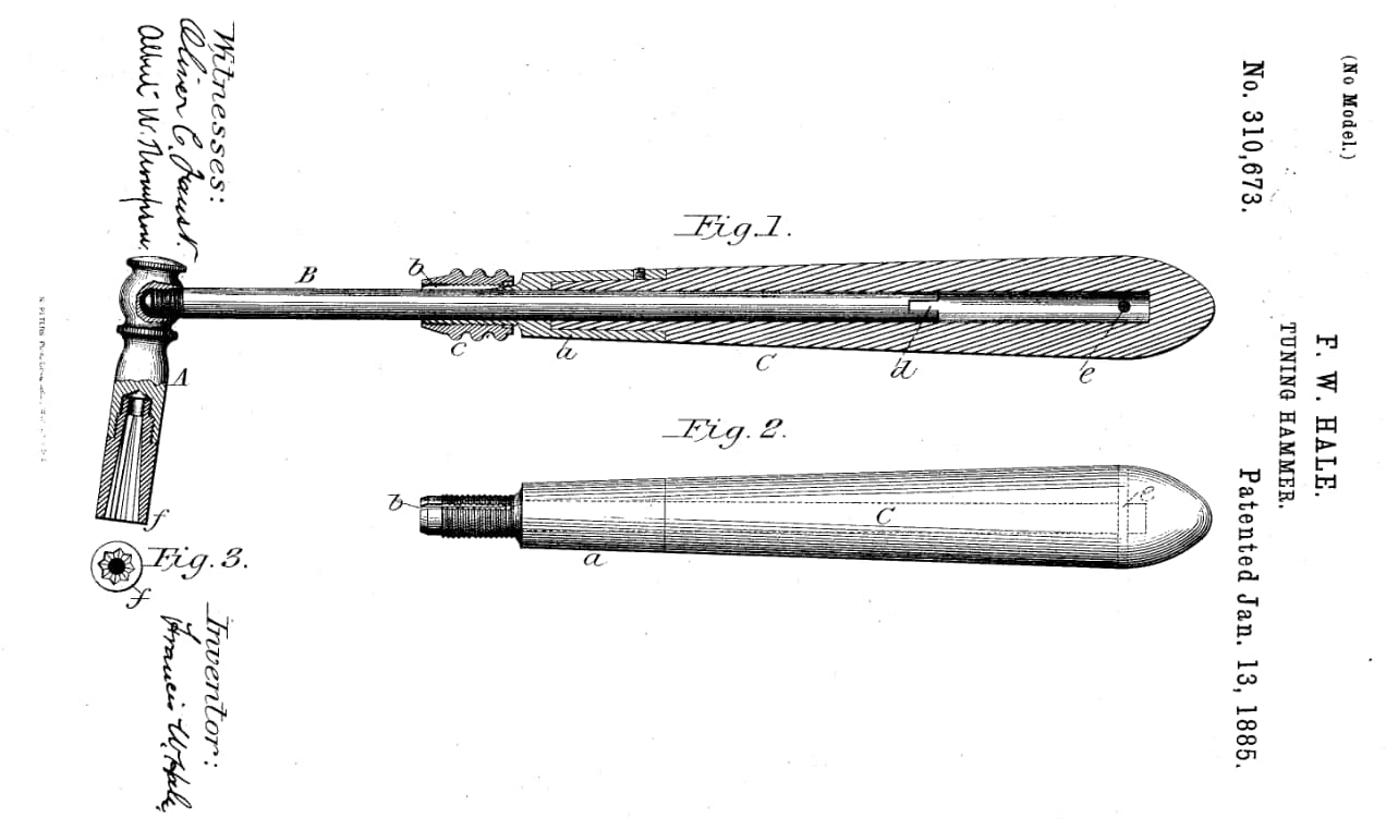Francis Wayland Hale (1853–1933) was a Tuning Instructor at The New England Conservatory of Music, as well as a student finishing his studies for the Bachelor of Music (1884) at Boston University when he submitted his patent application on February 26, 1884, for this tuning hammer.